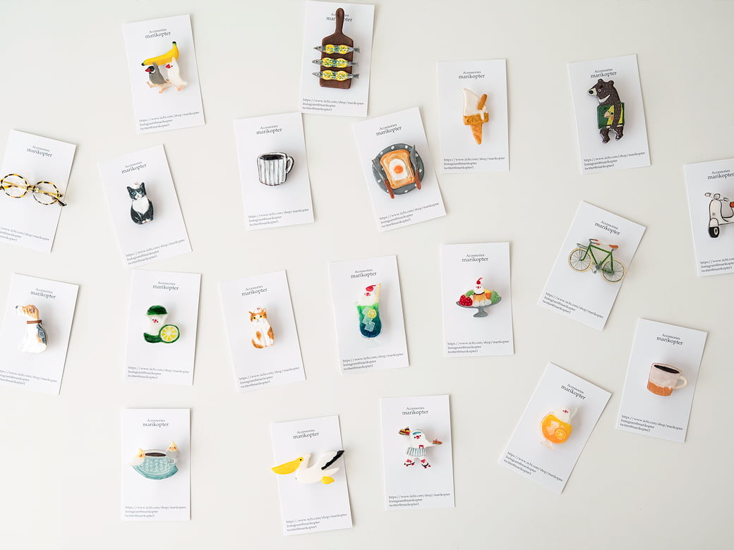 小さなブローチの中に愛嬌たっぷりのモチーフがずらり。手づくりの素朴な味わいとかわいいデザインのマリコプターさんのブローチが再入荷しました。