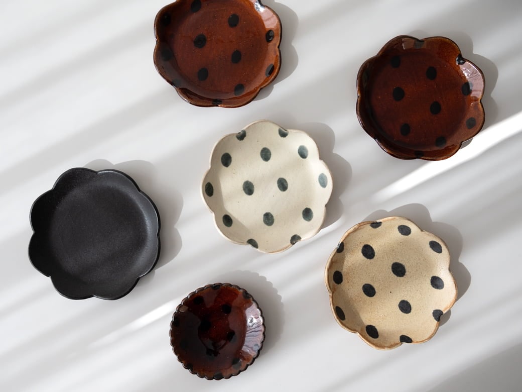 お花をかたどった輪花皿に、キュートな水玉模様がチャームポイントの器ですよ。