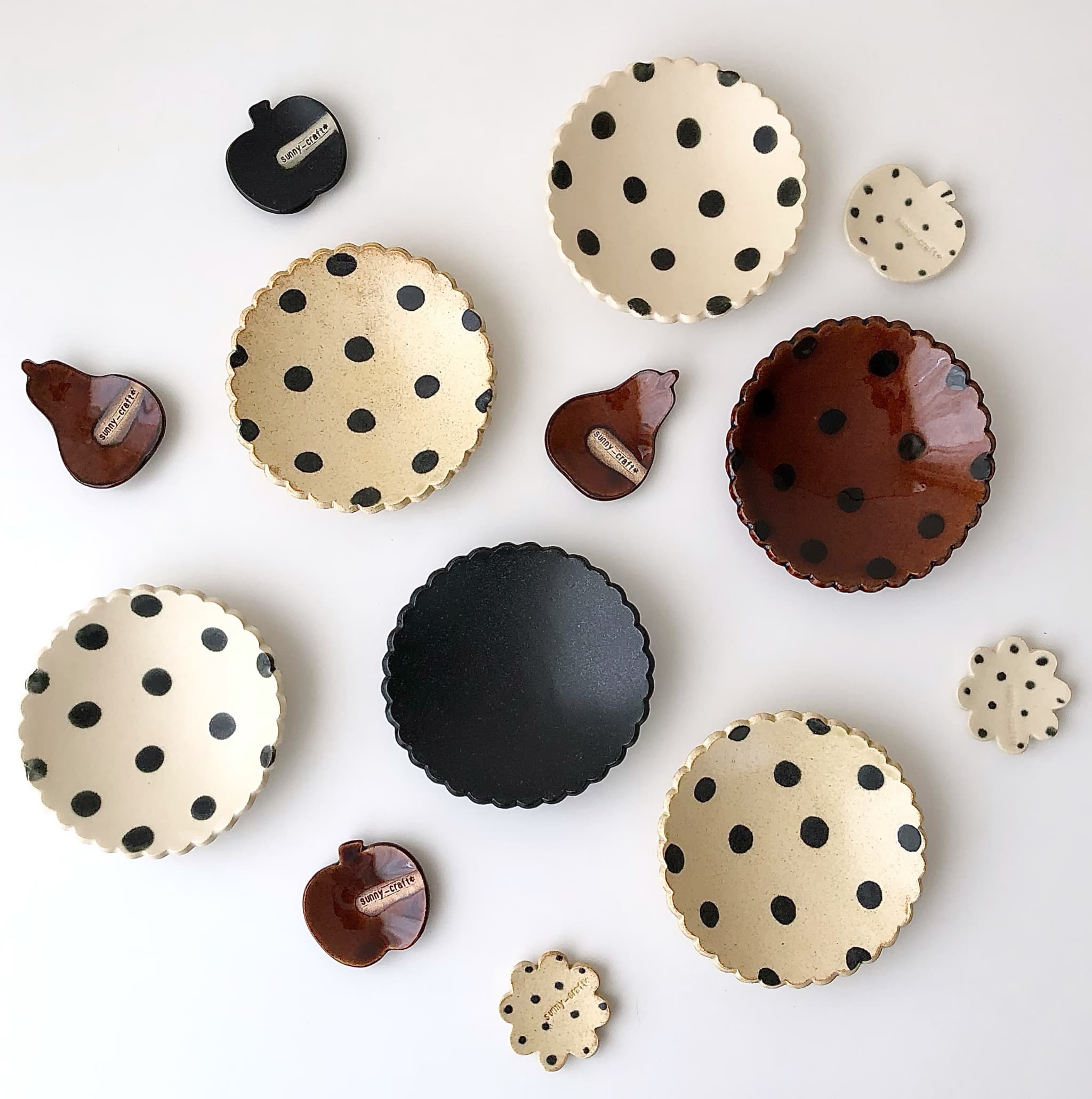 お花をかたどった輪花皿に、キュートな水玉模様がチャームポイントの器ですよ。