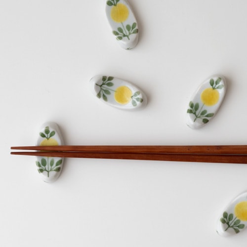 可愛くて華やかなお皿と箸置きが入荷しました。ころんと丸くて黄色のお花がキュートなデザインです。