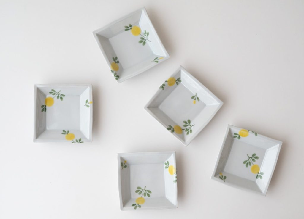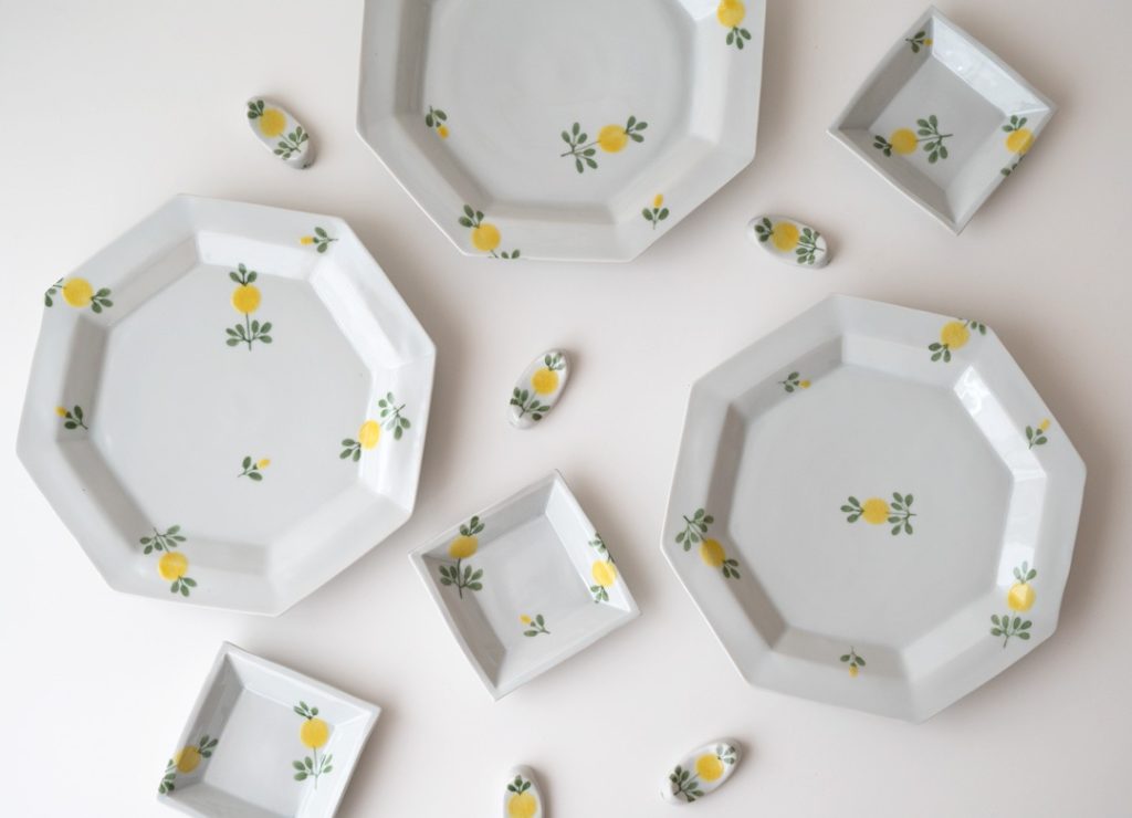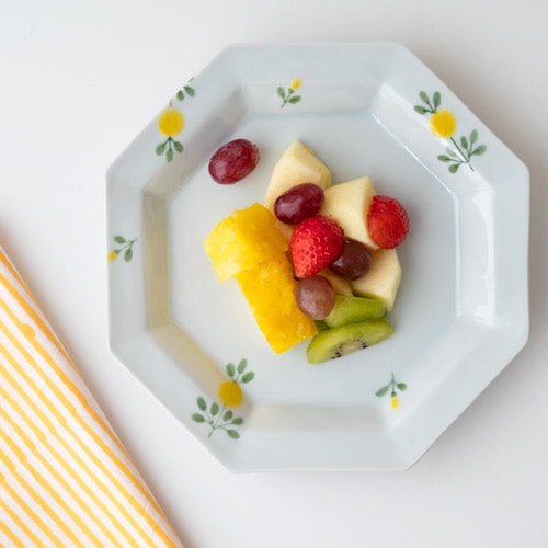 リム付き、八角形のすっきりとした器は、縁つきで使いやすい。四角形の小皿は、醤油皿にもほどよいサイズ。