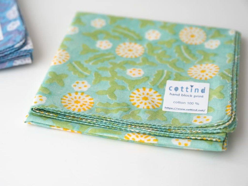 インドの染色技法『ブロックプリント』を使って染められたハンカチは、cottindさんのデザインにぴったり◎