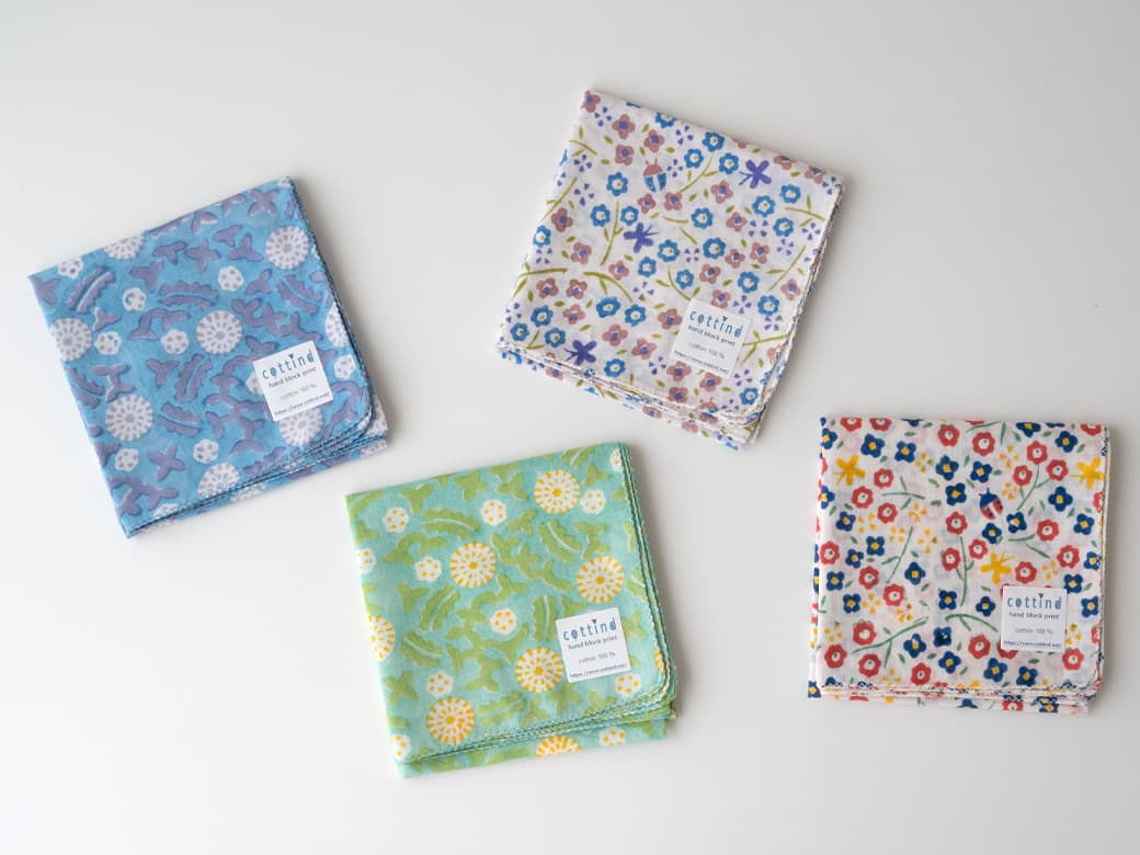 インドの染色技法『ブロックプリント』を使って染められたハンカチは、cottindさんのデザインにぴったり◎