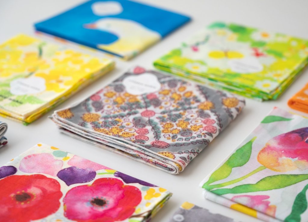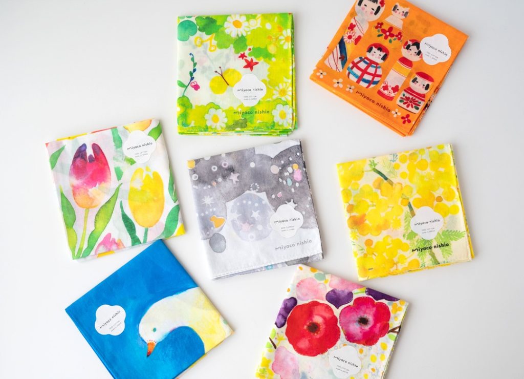 こちらのハンカチ。なんとスカーフにもなっちゃう大判ハンカチ。発色の良さが、miyaco nishioさんの世界観を鮮やかに映し出します。